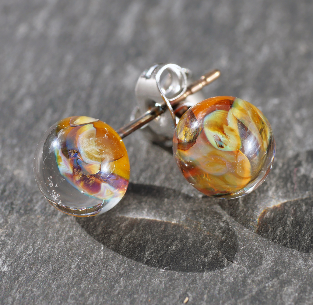 Náušnice kuličky ze žlutého a Double helixového vinutého skla – puzetky nerez ocel.